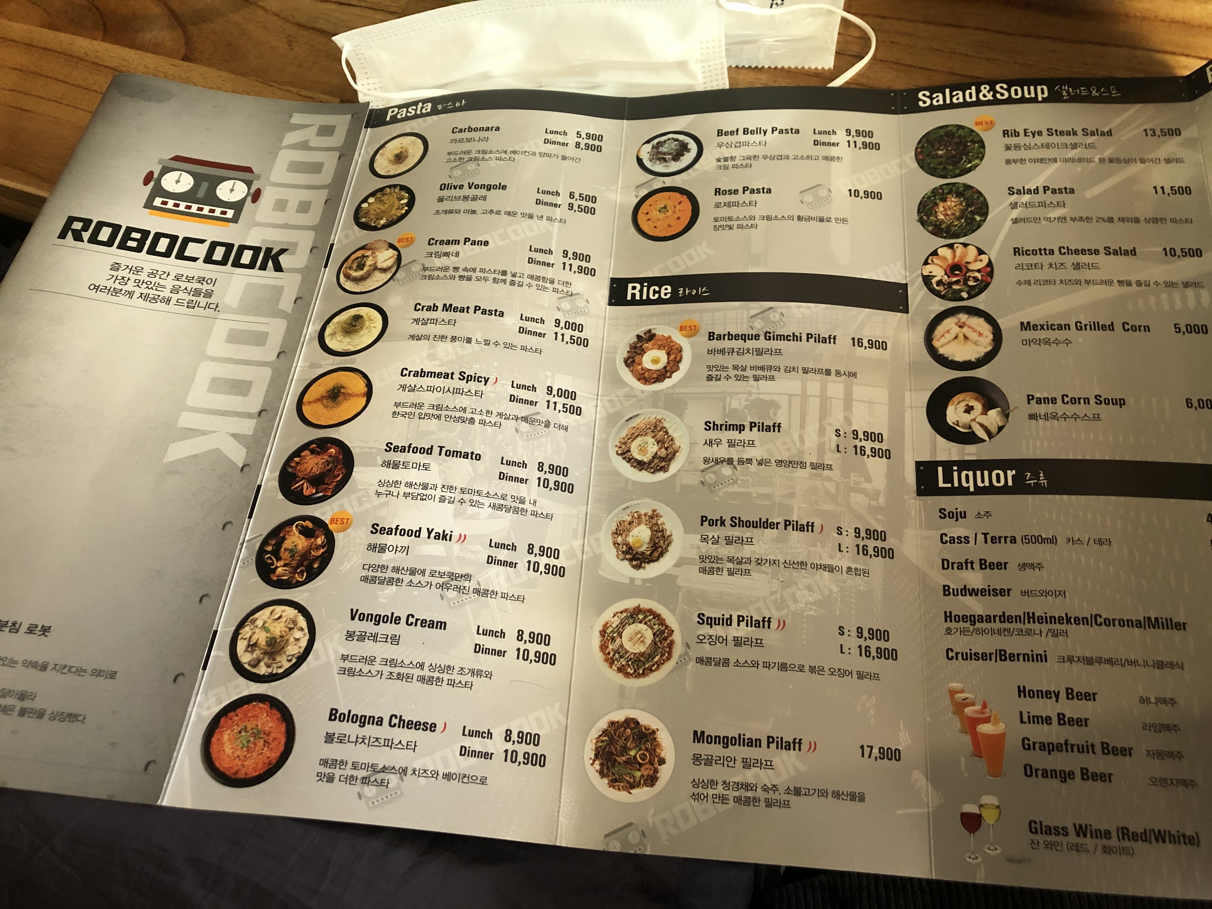 메뉴판은 이렇게 생겨있습니다. 파스타랑 필라프, 그리고 피자와 스테이크, 샐러드 등 다양한 메뉴들이 즐비하는데요.