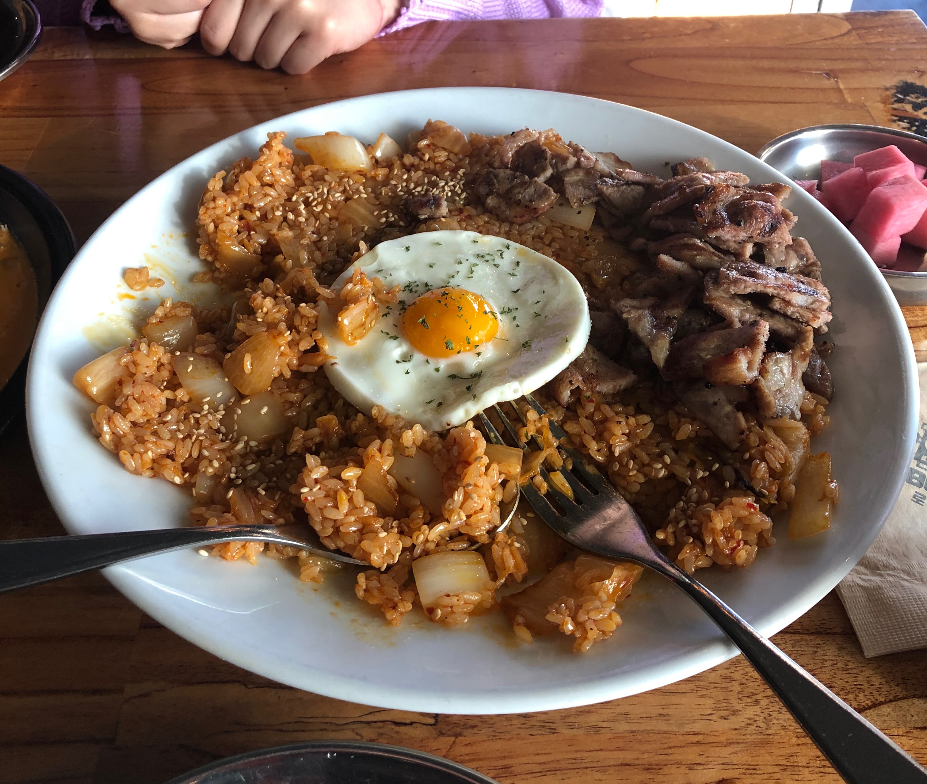 바베큐김치필라프의 반숙계란을 둘이서 신나하면서 터트리는 사진입니다ㅋㅋㅋ 역시 반숙계란은 터트려서 비벼줘야 제맛이죠~